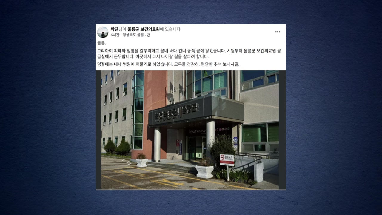 박 전 위원장은 SNS를 통해 이번 달부터 울릉군 보건의료원 응급실에서 근무한다며, 이곳에서 다시 나아갈 길을 살피겠다고 말했습니다.
