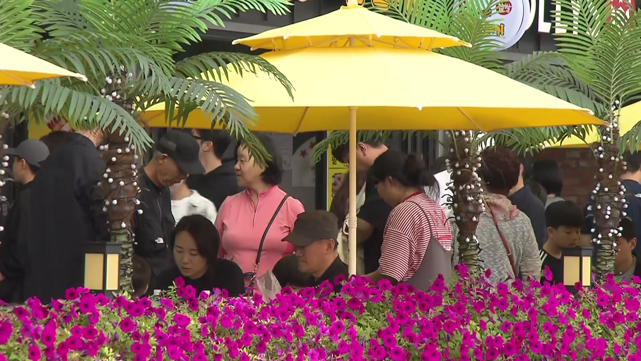제 뒤로 보이는 것처럼 야외 간식 판매대 앞은 장사진을 이루고 있고요, 내부 식당도 만석입니다.