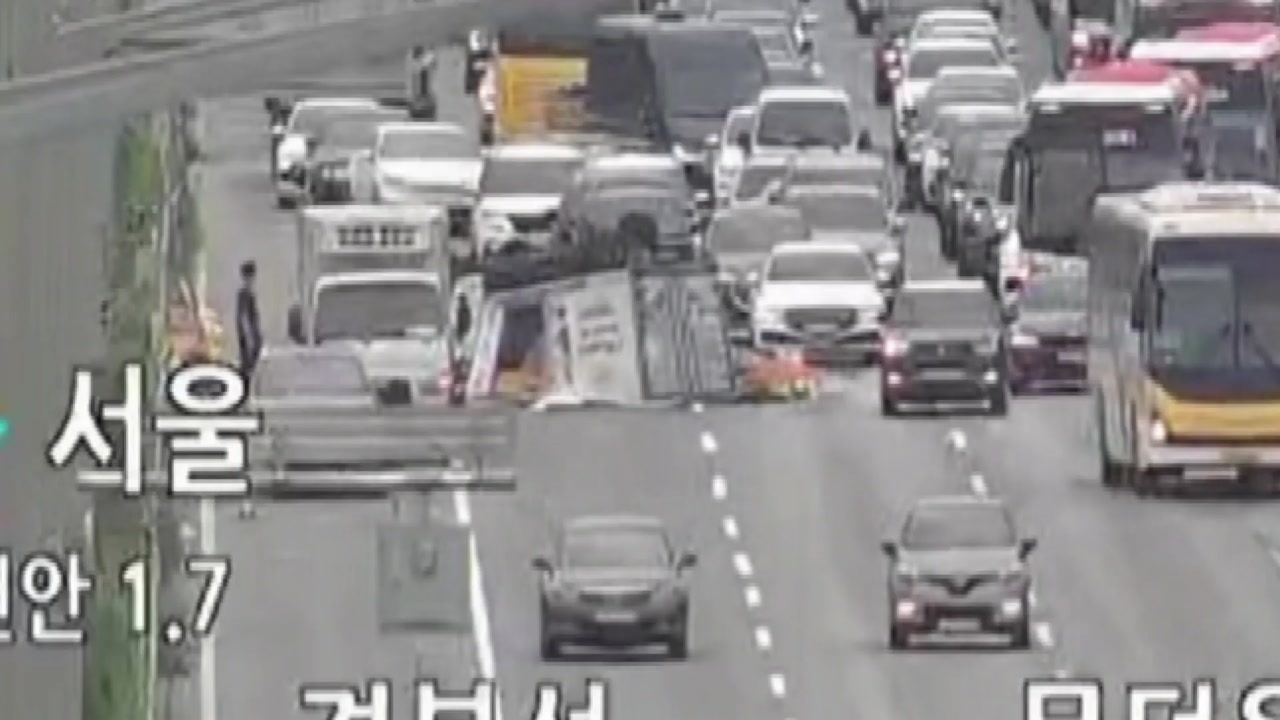 경부고속도로 서울방향 충남 천안 문덕육교 부근에서는 화물차가 뒤집혔습니다.