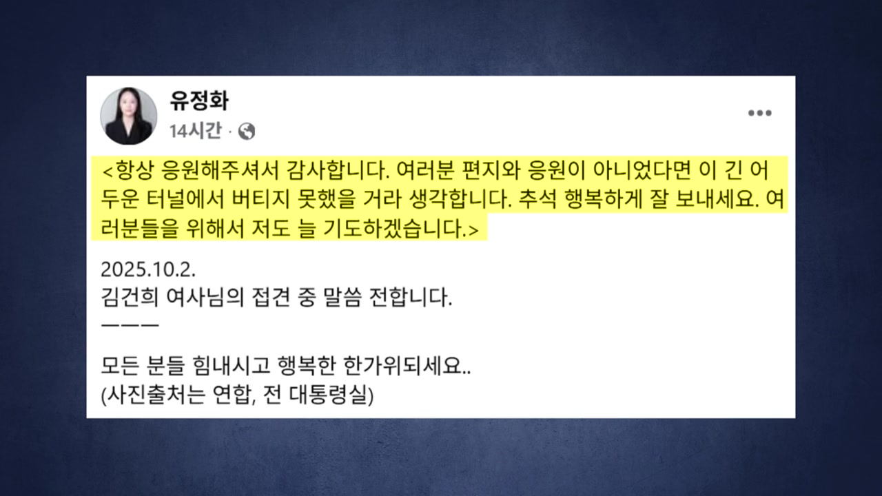 김 씨의 변호인 유정화 변호사는 어제(3일) SNS를 통해 지난 2일 김 여사 접견에서 들은 옥중 인사 내용을 공개했습니다.