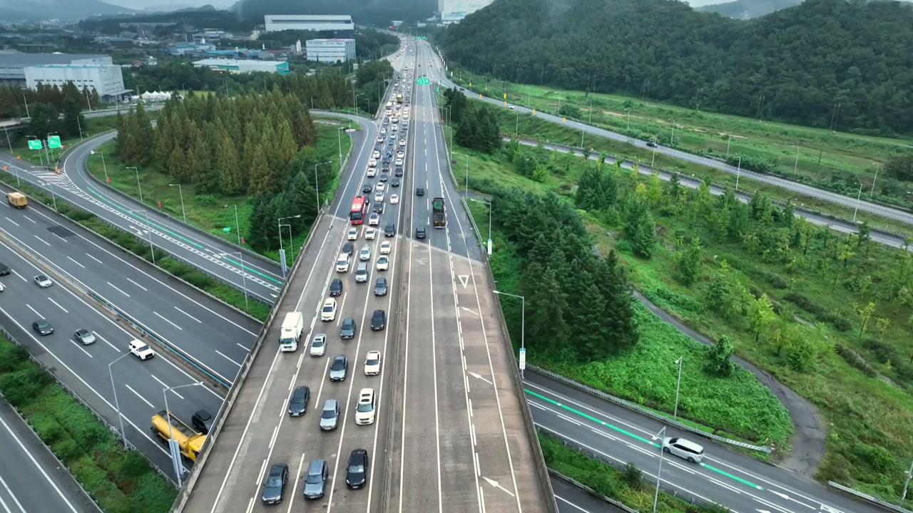 오른쪽에 보이는 도로가 부산으로 내려가는 방향입니다.