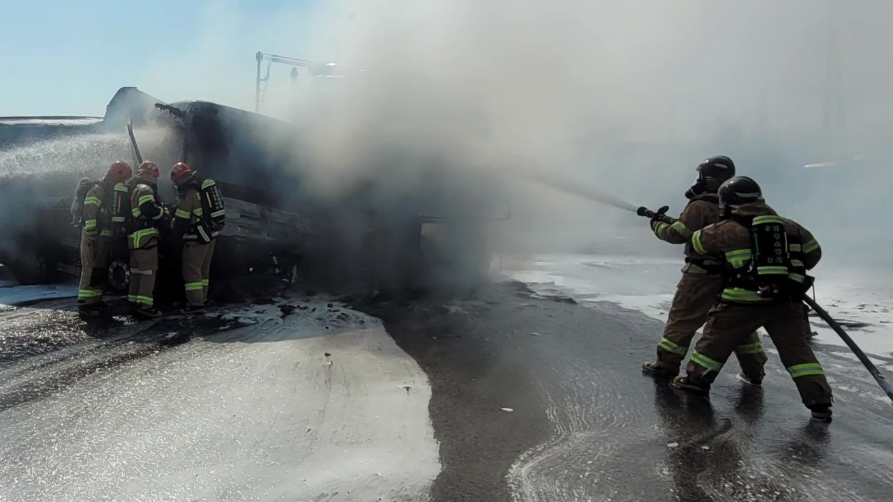 울산 황성동 용연사거리에서 대형 화물차 두 대가 충돌하며 차량에 불이 붙었습니다.