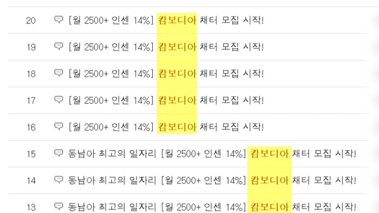 실제로 저렇게 유인되는 경우는 많이, 캄보디아로 직접 유인되는 것보다는 인접국으로, 인접국에 여행 같은 거나 사업으로 해서 국경으로 넘어가는 형태가 퍼지게 됩니다. 그러니까 캄보디아에 집중하다 보니까 이게 퍼져서 풍선효과가 나서 베트남이라든가 아니면 다른 동남아 국가로. 그러니까 이런 형태로 뭔가가 낌새가 이상하다 하면 한번쯤은 의심을 해야 되는 상황으로 꼭 보시면 될 것 같습니다.