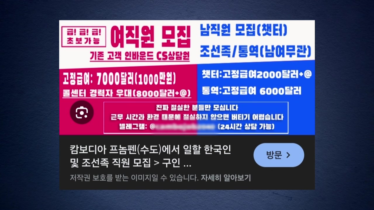 A 씨가 연락한 취업 광고 속 텔레그램 아이디는 삭제됐고 광고가 올라왔던 게시판도 폐쇄됐지만, 지금도 여기저기서 비슷한 구인 글이 한국인들을 유혹하고 있습니다.