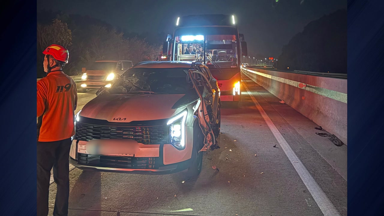 충북 영동군 경부고속도로 황간나들목에서 SUV 차량이 앞서 가던 25톤 트럭을 들이받았습니다.