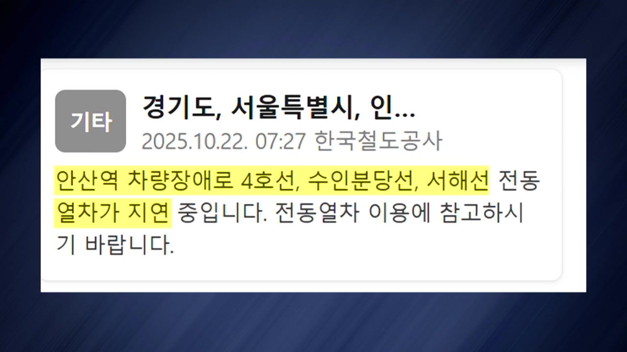 코레일은 재난안전문자를 통해 안산역 차량 장애로 4호선과 수인분당선, 서해선 열차가 지연 중이라며 수도권 시민들에게 주의를 당부했습니다.