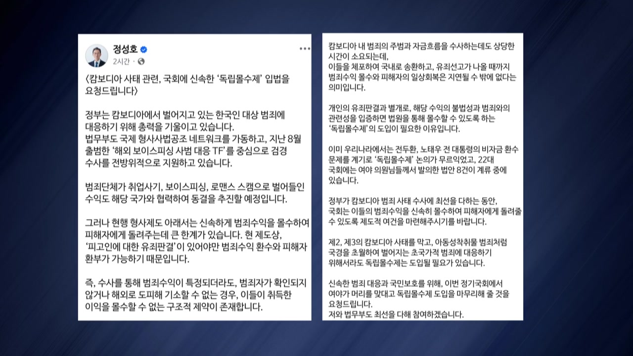 정 장관은 오늘(22일) SNS를 통해 제2, 제3의 캄보디아 사태를 막고 초국가적 범죄에 대응하기 위해 독립몰수제 도입이 필요하다고 밝혔습니다.