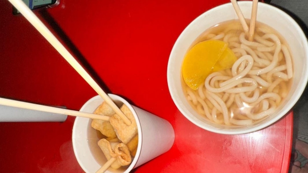 사진에는 어묵 꼬치 3개와 우동 한 그릇이 담긴 용기가 담겼다. A씨에 따르면 어묵은 3,000원, 우동은 8,000원이었다.