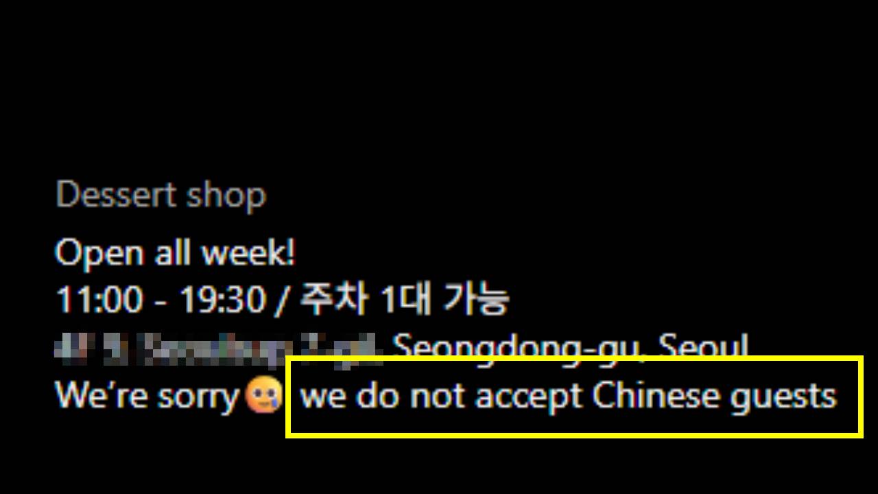 지난 27일, 성수동의 한 카페 인스타그램 소개에 '중국인을 받지 않는다'라는 글이 영어로 적혀 있다는 내용이 SNS에서 퍼졌다. 해당 업장은 21일부터 중국인을 출입 금지하겠다고 고지하고 실제로 중국인 손님을 받지 않았다고 알려졌다.
