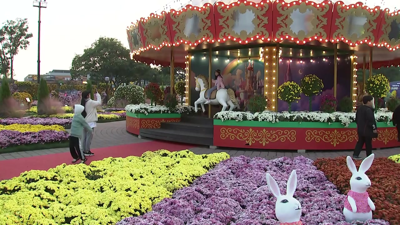 형형색색의 국화 옷을 입은 조형물들과 함평군이 육종한 신품종 국화들이 모여 마치 마법 같은 풍경을 선사하는데요, 한가운데 위치한 회전목마 포토존에서는, 가을 추억을 남기는 방문객들의 웃음소리가 끊이지 않고요.