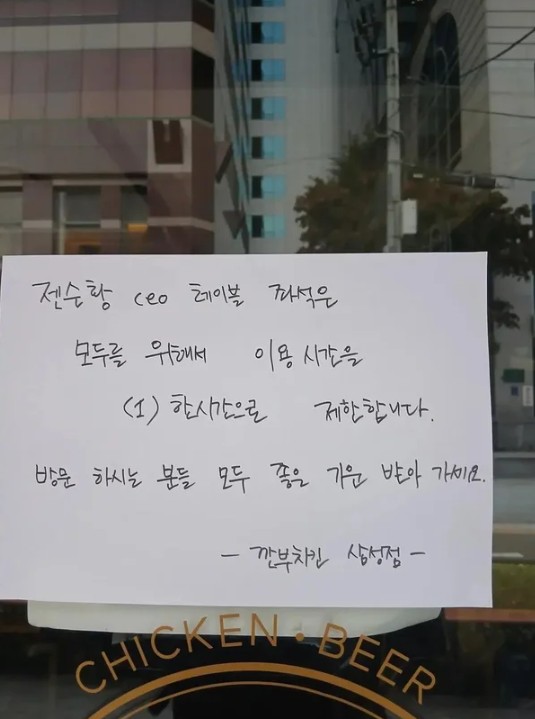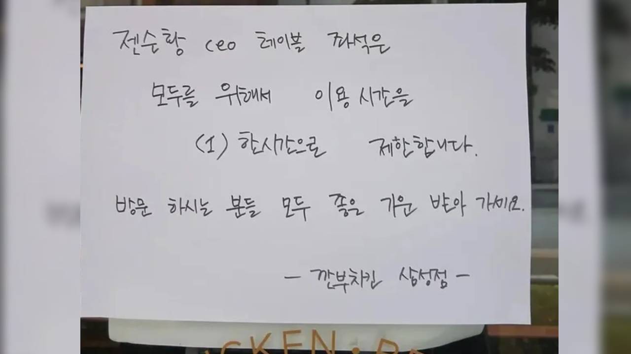 사진을 보면, 깐부치킨 삼성점 창가에 "젠슨 황 CEO 테이블 좌석은 모두를 위해 이용 시간을 한 시간으로 제한합니다. 방문하시는 분들 모두 좋은 기운 받아 가세요"라는 공지가 붙어 있다.
