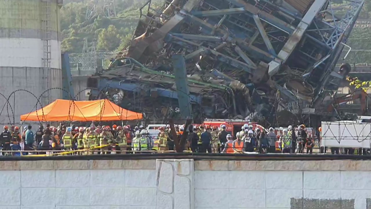 지금 한국동서발전 울산화력에서 붕괴 사고가 발생했는데요. 지금 보시는 건물은 60m 높이의 보일러 타워입니다. 그러니까 화력발전에서 보일러 시설이라고 보시면 되는데요. 화면에서 넓게 보면 보일러 구조물이 3개가 있고 그 옆에 또 굴뚝이 3개가 보입니다. 그래서 보일러 구조물 3개 중에서 중간에 있는 구조물이 붕괴된 것으로 알려져 있고요. 그래서 지금 대형 시설물이 무너지면서 작업자가 깔려서 소방당국에서 구조를 벌이고 있는데 처음에는 9명이 매몰됐는데 2명은 구조가 됐고 나머지 7명이 아직 매몰돼 있는 상태로 추정되고 있습니다.