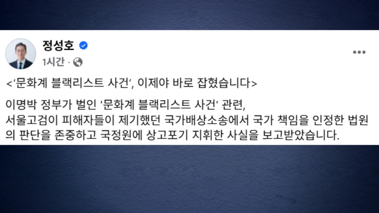 정성호 법무부 장관은 이른바 '문화계 블랙리스트' 사건과 관련해 국가배상 소송에서 국가 책임을 인정한 법원의 판단을 존중하고 검찰이 상고 포기했다고 전했습니다.