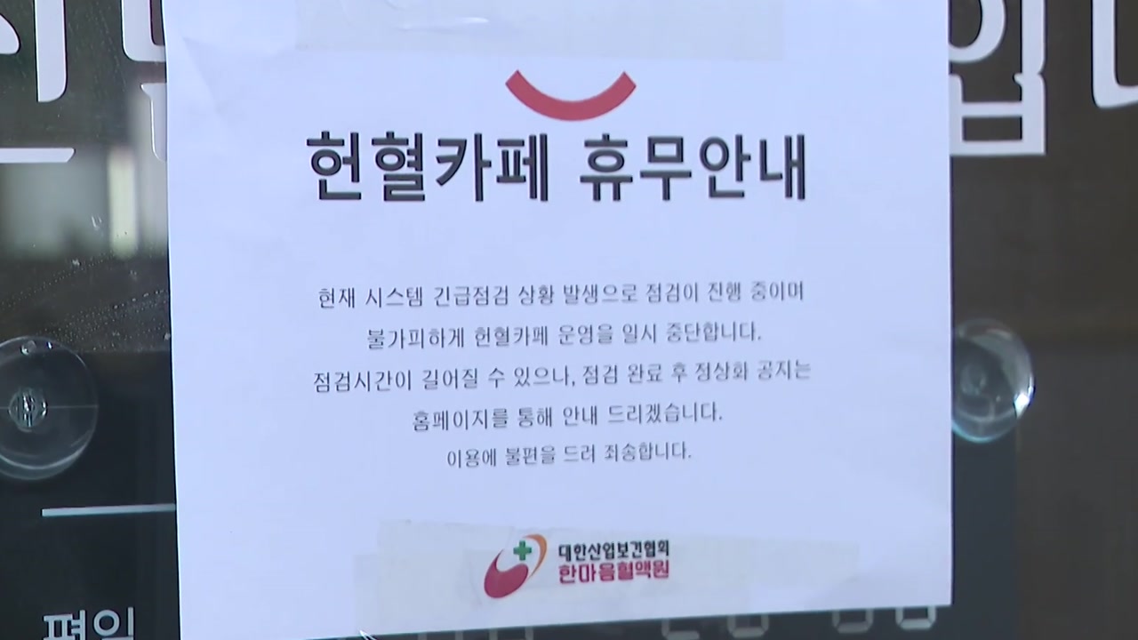 서울 도심에 있는 헌혈 카페에 긴급점검으로 운영을 중단한다는 안내문이 붙었습니다.