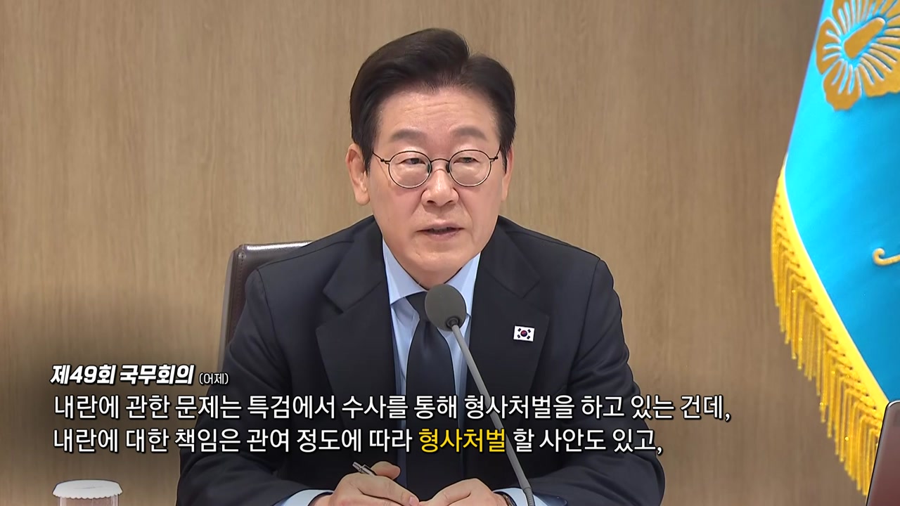 [이재명 / 대통령 (어제 국무회의) : 내란에 관한 문제는 특검에서 수사를 통해 형사처벌을 하고 있는 건데, 내란에 대한 책임은 관여 정도에 따라 형사처벌 할 사안도 있고, 또는 행정 책임으로 물을 사안도 있고, 인사상 문책이나 인사 조치를 할 정도의 낮은 수준도 있기 때문에 필요할 것 같습니다. 특검에 의존할 게 아니고 독자적으로 해야 할 것 같아요.]