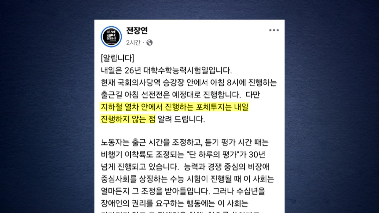 전장연은 오늘(12일) 언론 공지를 통해, 수능 당일에는 지하철 열차 안에서 진행하는 포체투지는 하지 않을 예정이라고 밝혔습니다.