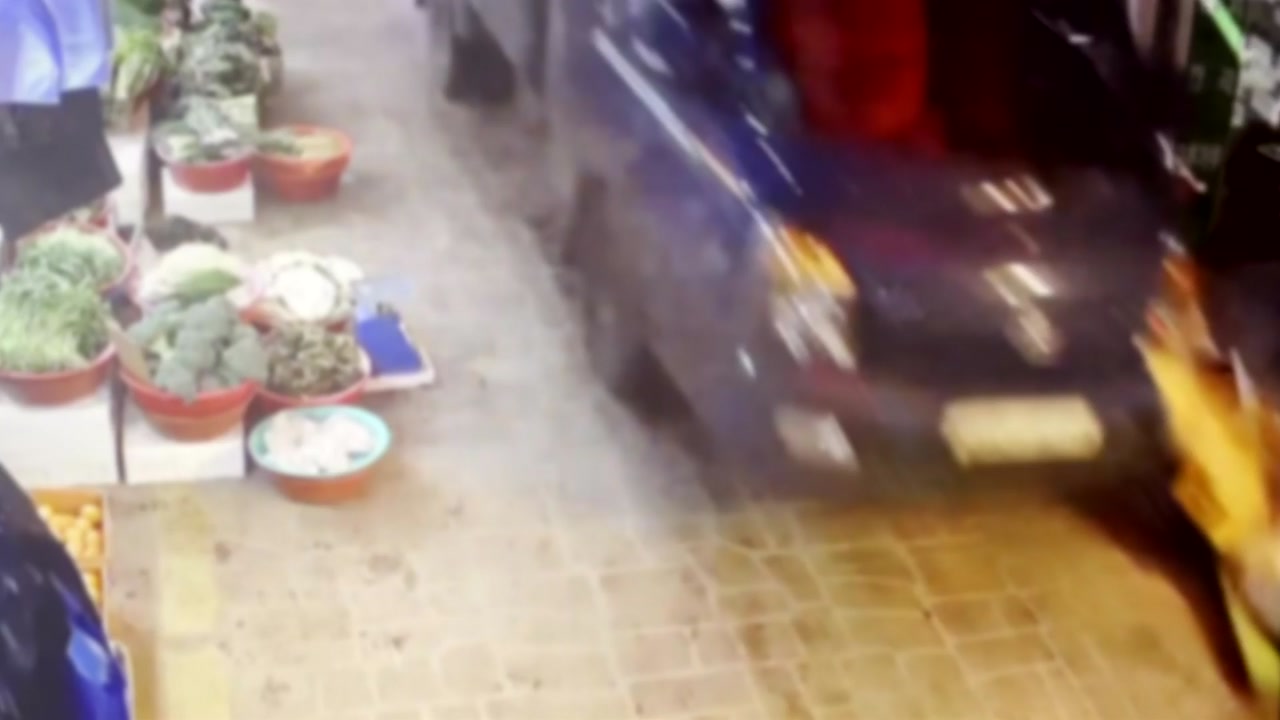 시장 안의 가게 앞에 서 있던 화물차가 갑자기 속도를 높이며 출발하는데, CCTV에는 빠른 속도로 달리는 차량이 매대와 사람들을 치고 지나가는 모습이 포착됐습니다.
