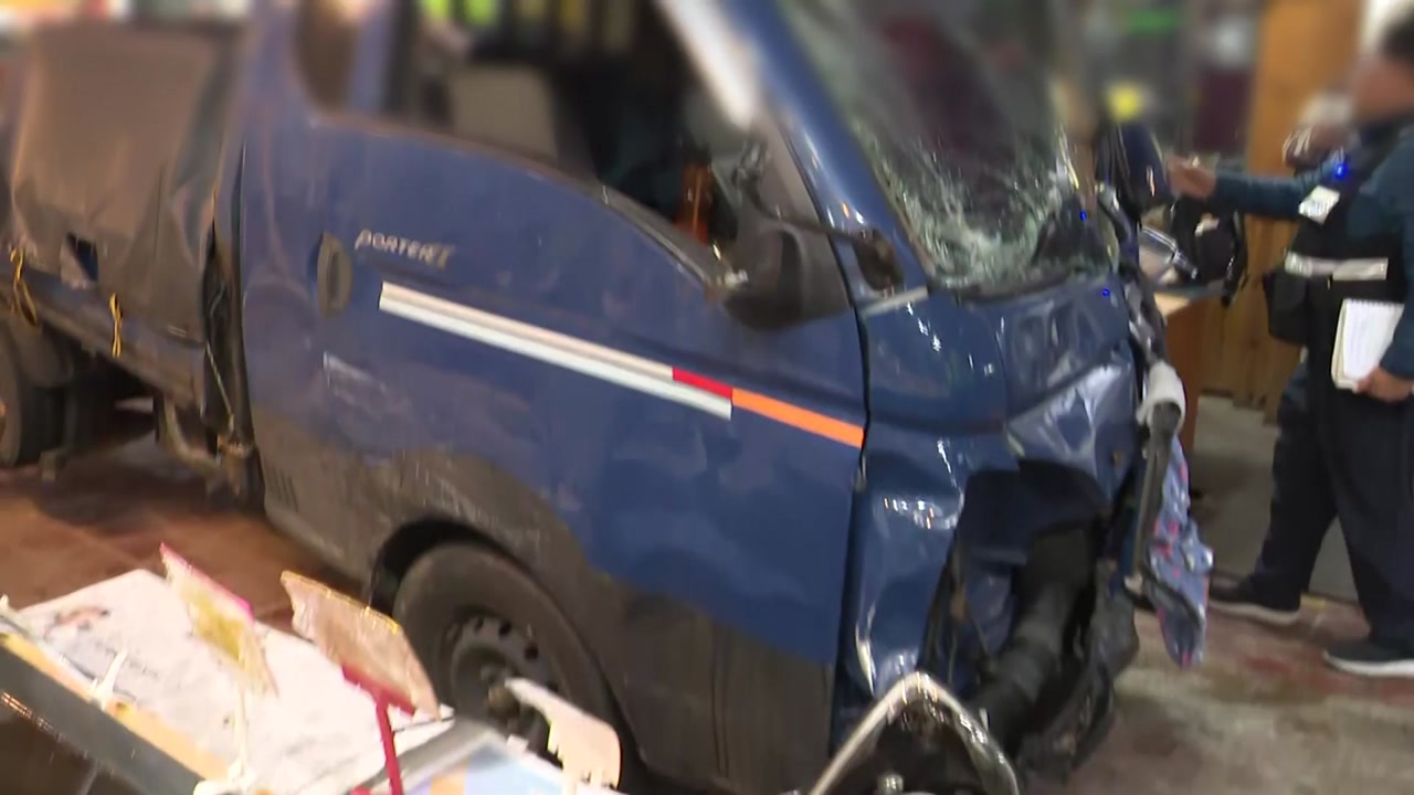 돌발 상황에 주변에 있던 시민들도 돌아보는 가운데, 화물차는 매대를 치고도 그대로 내달립니다.