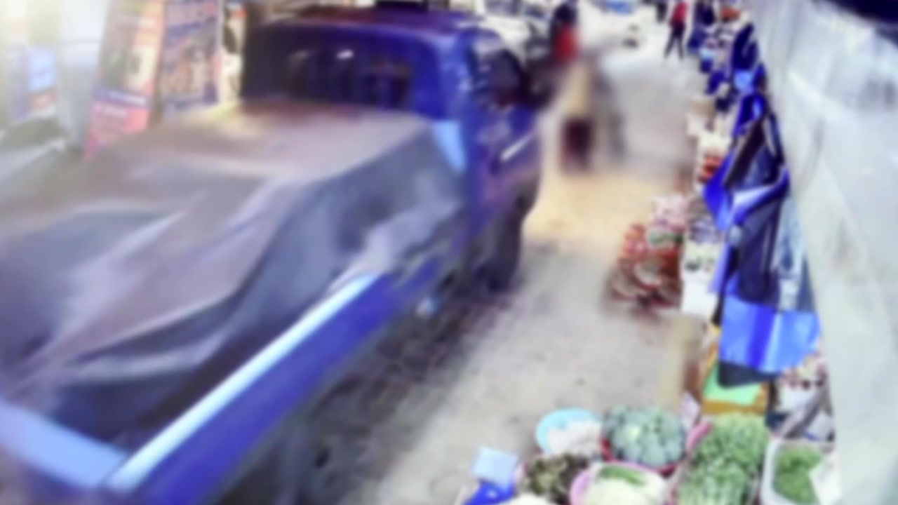 차량은 매대는 물론 상인과 손님들을 잇달아 치면서도 멈추지 않고 달립니다.