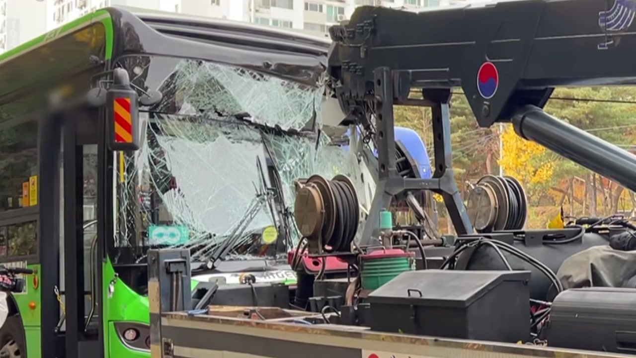 앞유리가 운전석 쪽으로 무너져 내린 버스가 앞바퀴가 들려 견인됩니다.