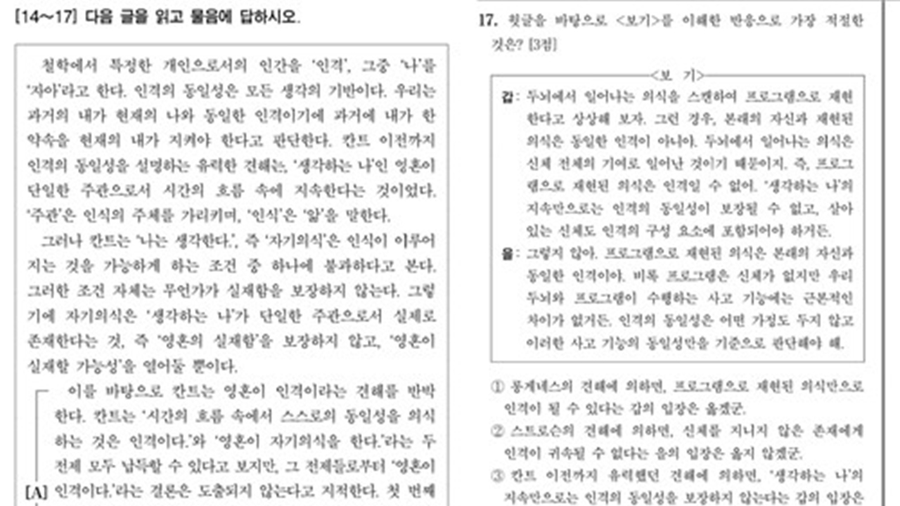 '불수능'이었다는 이번 수능에서도 고난도 문항으로 꼽히는 국어 17번은 독일 철학자 임마누엘 칸트의 인격 동일성에 관한 견해를 담은 지문을 읽고 푸는 문제다. 두뇌에서 일어나는 의식을 스캔해 프로그램으로 재현한 경우, 본래의 자신과 재현된 의식은 동일한 인격이 아니라는 '갑'의 주장을 제시한 뒤 이를 이해한 반응으로 가장 적절한 것을 찾으라고 요구한다.