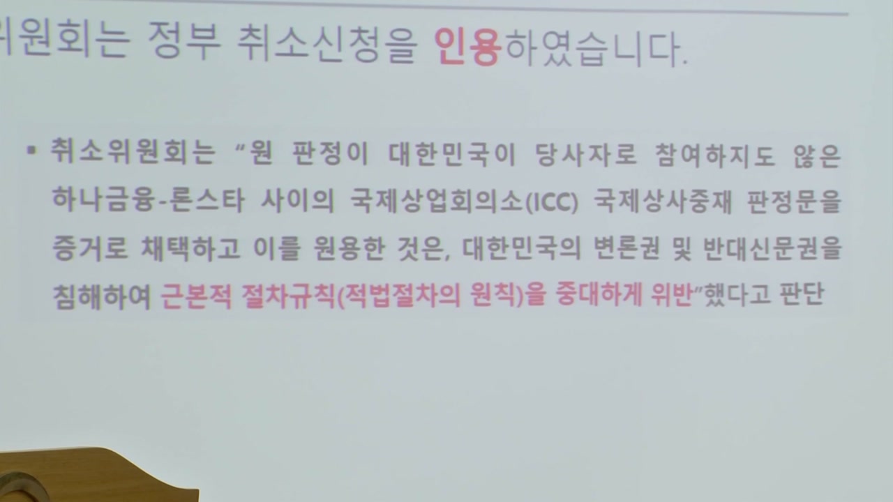 정부는 이 가운데 앞선 중재판정부가 하나금융과 론스타 사이 상사중재 사건의 판정문을 주요 증거로 사용해, 우리 정부의 배상책임을 인정한 점을 '적법절차 원칙 위반'으로 문제 삼았습니다.