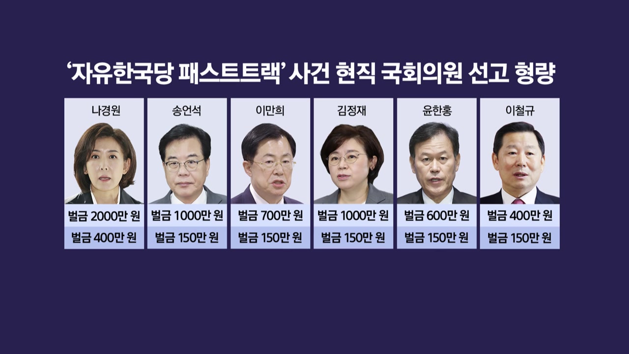 당시 원내대표였던 나경원 의원은 특수공무집행방해 등 혐의에 대해서는 벌금 2천만 원, 국회법 위반 혐의에 대해서는 벌금 4백만 원이 선고됐고, 국민의힘 송언석 원내대표는 각각 벌금 1천만 원과 150만 원을 선고받는 등 현직 국회의원 6명 모두 벌금형을 선고받았는데, 의원직 상실형은 면했습니다.