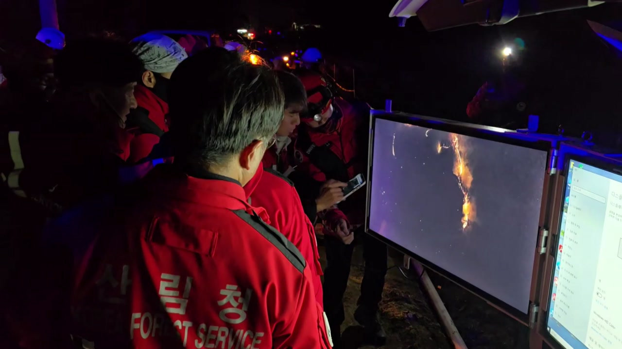 야간이라 헬기를 투입하기 어려운 상황에서 불은 산 정상 방향으로 확산했고 산림 당국은 대응 1단계를 발령했습니다.