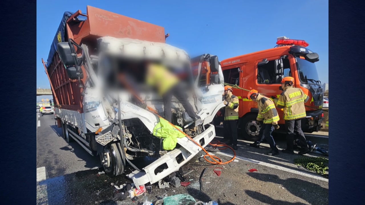 인천 남동구에 있는 고속도로에서 5톤 집게차가 25톤 화물차를 들이받아 1명이 병원으로 이송됐습니다.