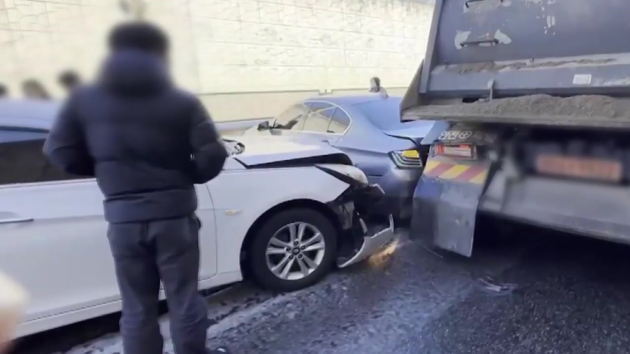 [사고 목격자 : 미끄러져서 앞에 있던 두 차가 이렇게 부딪쳐서, 모닝도 완전히 180도 돌아 있었거든요. (브레이크 잡는데) 바닥이 빙판이었기 때문에 드르르 밀렸는데…]