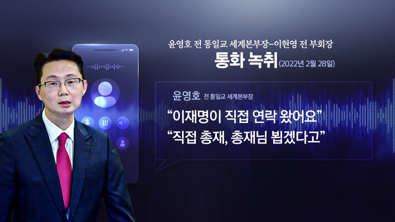 윤 전 본부장은 20대 대선을 9일 앞에 두고서는 이재명 당시 후보 쪽에서도 직접 한학자 총재를 뵙기 위해 전화가 왔다고 말하기도 했는데, 이미 '한 총재 의도가 명확하다'면서 한 총재가 윤석열 당시 후보를 선택해 연결해줄 수 없다는 취지로 언급했습니다.
