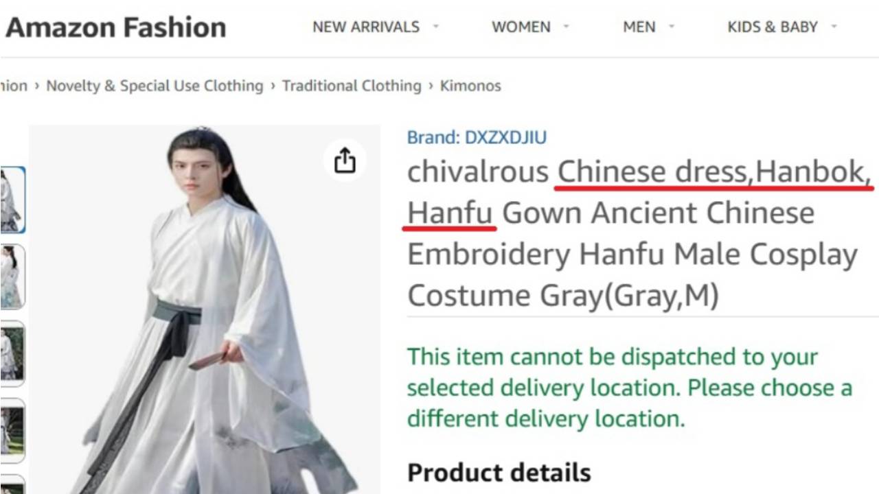 전 세계 누리꾼들이 이용하는 글로벌 전자상거래 플랫폼 아마존에서 일부 판매 업체들이 중국 전통 의상인 ‘한푸’를 ‘한복’으로 표기해 판매하는 사례가 발견됐다.