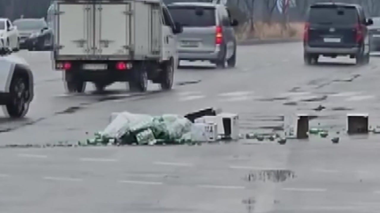 경찰은 1톤 화물차가 좌회전하다가 짐칸에 실린 소주 상자들이 도로에 떨어진 것으로 보고 있습니다.