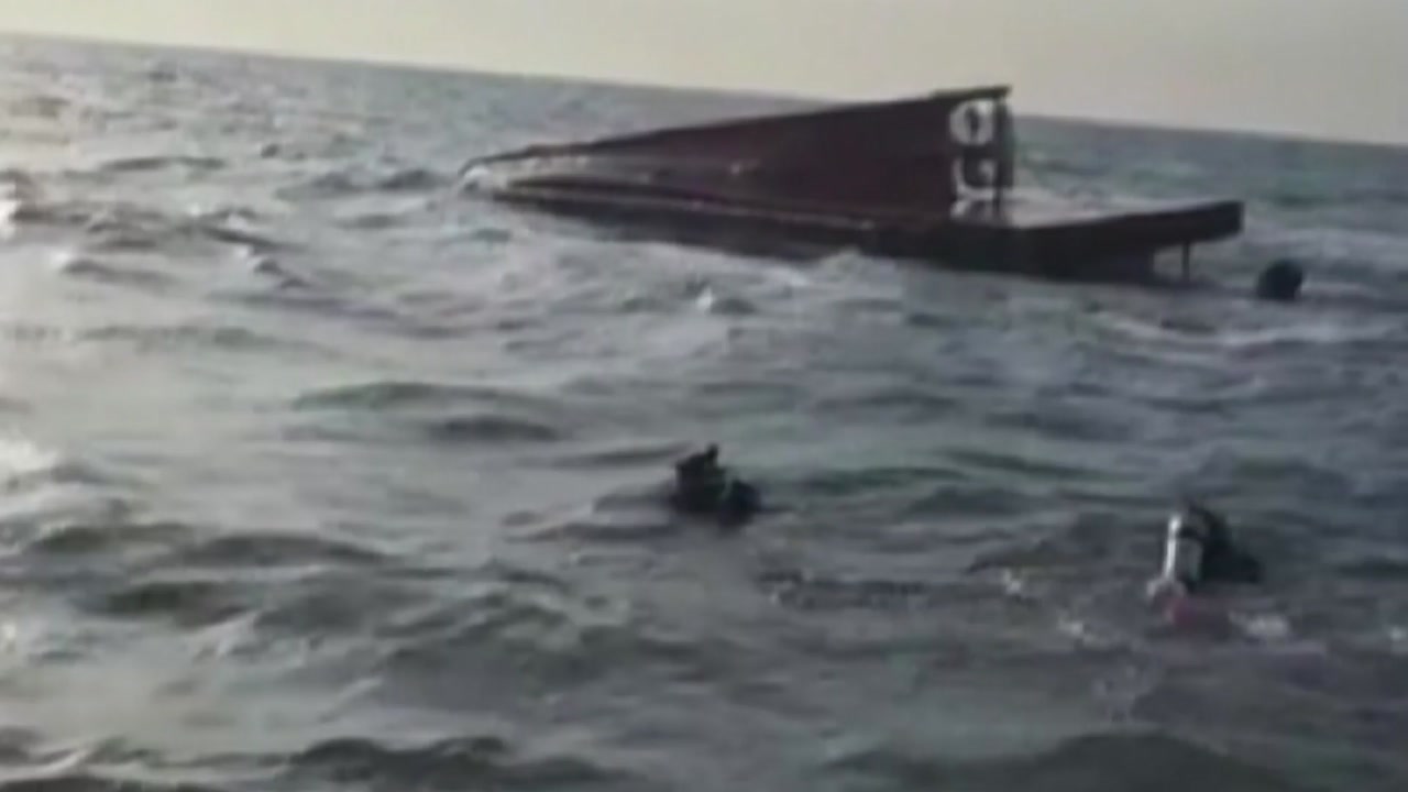 배는 완전히 뒤집혀 선체 아래쪽이 수면 위로 드러났습니다.