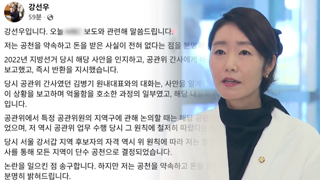 앞서 한 언론은 3년 전 민주당 서울시당 공천관리위원이었던 강 의원이 당시 예비후보였던 김경 서울시의원이 준 1억 원을 지역 보좌관이 받아 보관했다며, 공관위 간사였던 김병기 전 원내대표와 상의했다고 보도했습니다.