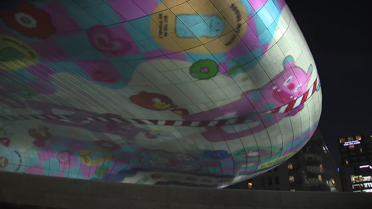 보시는 것처럼 오색찬란한 빛이 DDP 건물 벽면을 가득 메우고 있습니다.