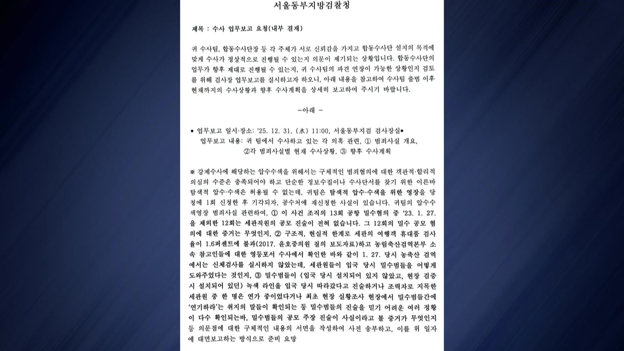동부지검은 수사 업무보고 요청서에서 "(마약) 밀수범의 진술을 믿기 어려운 여러 정황이 확인된다"며 세관 공무원과 밀수범의 공모 증거 등을 구체적으로 제시하라고 요구했습니다.