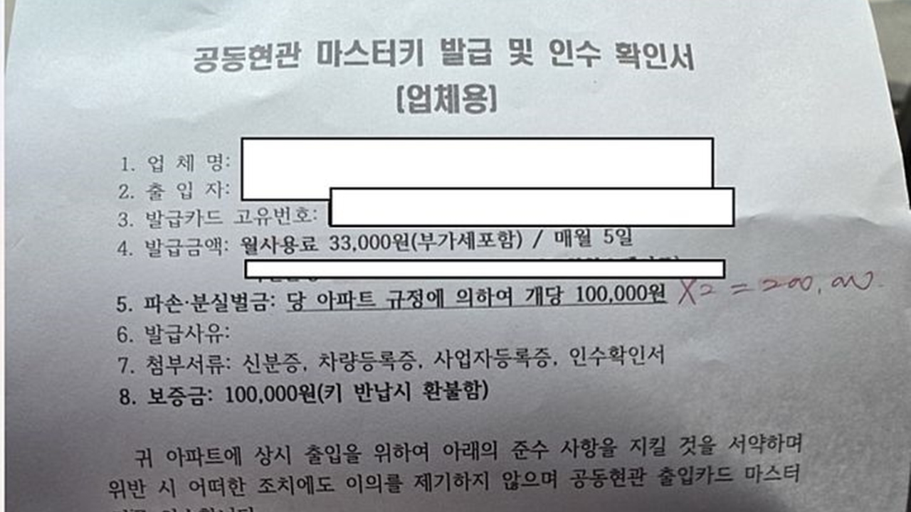 특히, 아파트에 출입하려면 매월 5일 3만 3천 원을 내야 하며, 마스터키 파손이나 분실 시 개당 10만 원을 변상해야 한다는 내용이 눈길을 끈다.