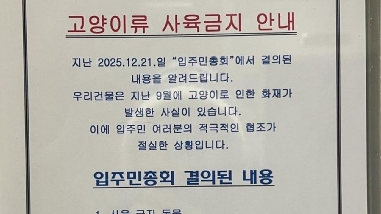 앞서 관리실 측은 지난해 9월 고양이로 인한 오피스텔 화재가 발생했다며 입주민의 협조를 요청하는 차원에서 이같이 공지한 것으로 파악됐다.