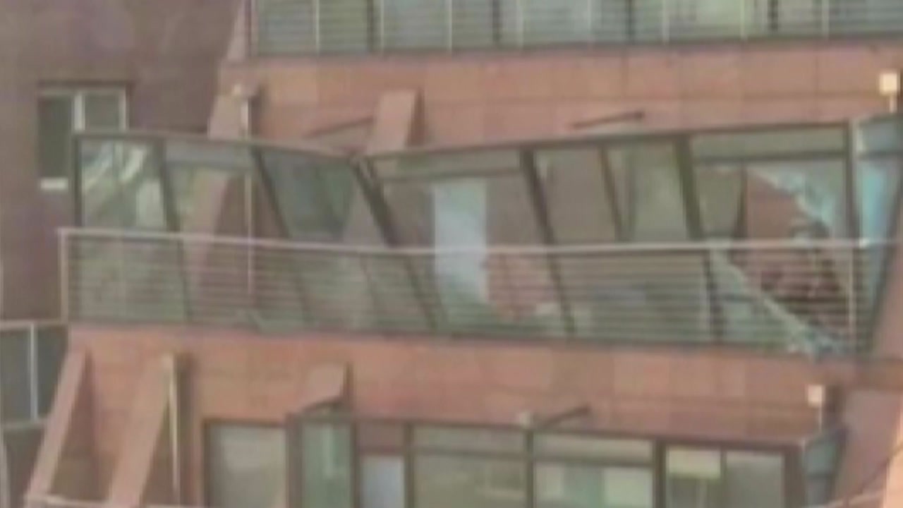 강풍으로 휘어진 구조물에 다른 유리창들도 기울어져, 곧 떨어질 것 같이 위태로운 모습입니다.
