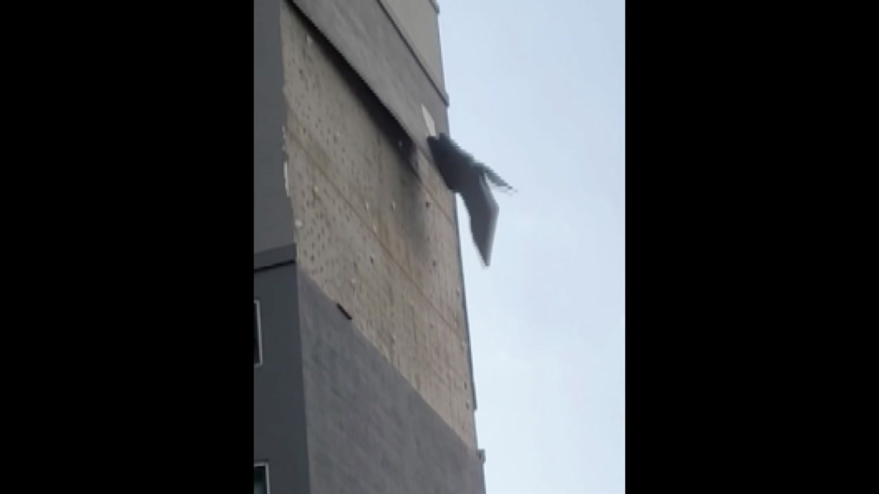 제보자는 지금도 강풍에 외벽이 계속 떨어져 나가고 있다며, 소방과 경찰 관계자들이 출동해 수습 중이라고 설명했습니다.
