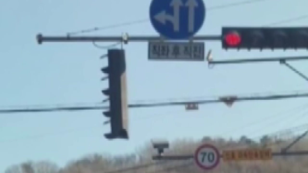 오늘 오후 2시 반쯤 경기 광주시 신현동에 있는 교차로에서 신호등이 곧 떨어질 것처럼 위태롭게 버티고 있는 모습입니다.