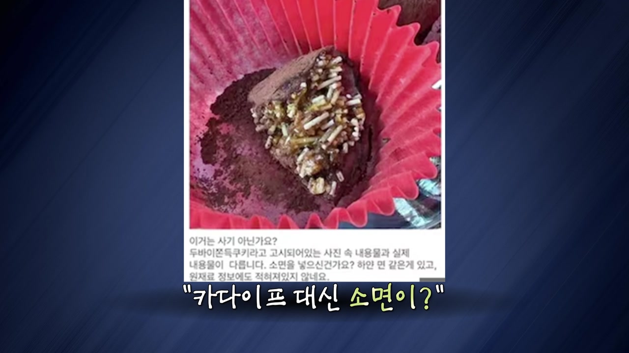 이 정도면 사기 아니냐며 제품 사진과 실제 내용물이 다르고, 원재료 표기에도 없는 면이 들어 있었다며 카다이프 면 대신 소면을 사용한 것 아닌지 의심된다고 글을 올렸습니다.