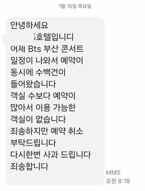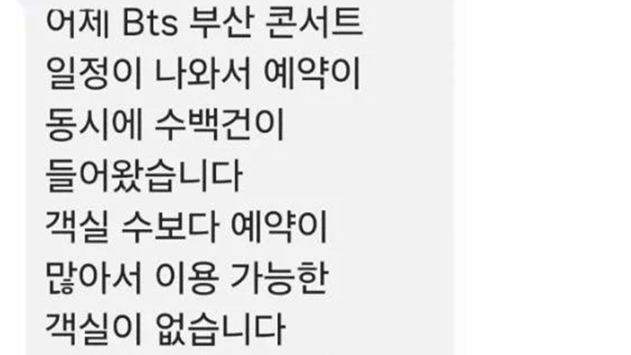 한 누리꾼이 소셜미디어(SNS)를 통해 공개한 문자 메시지에 따르면, 이 누리꾼은 호텔 측으로부터 "어제 BTS 부산 콘서트 일정이 나와서 예약이 동시에 수백 건이 들어왔다. 객실 수보다 예약이 많아서 이용 가능한 객실이 없다. 죄송하지만 예약 취소 부탁드린다"는 문자메시지를 받았다.