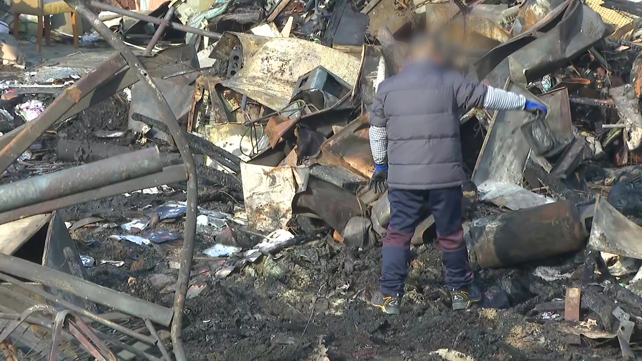 삽으로 잿더미를 뒤적이며 건질 만한 물건이 있는지 살펴보지만, 이내 빈손으로 돌아서고 맙니다.