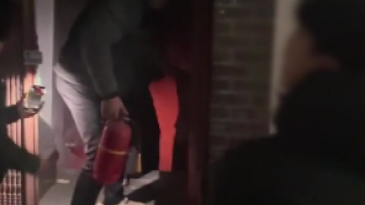 소화기를 들고 입구에 선 남성은 계단 아래를 향해 다급히 소리칩니다.
