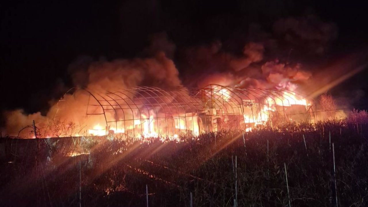 네, 비닐하우스에서 시뻘건 불길이 치솟고 있습니다.