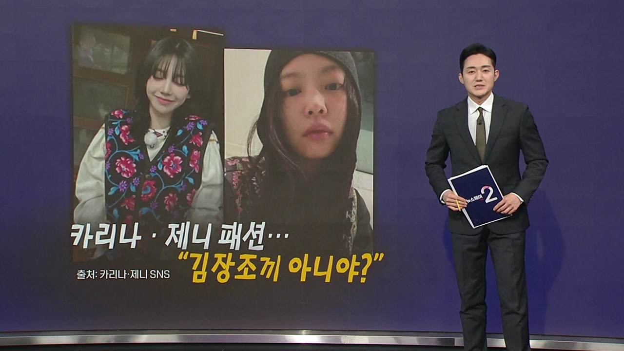 가수 카리나와 제니가 유사한 꽃무늬 조끼를 입고 있습니다.