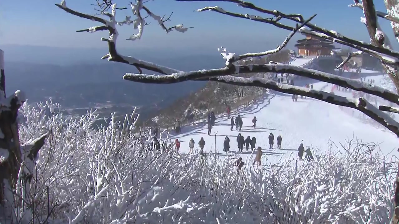 주봉인 해발 1,614m의 향적봉 표지석 앞은, 순백의 풍광을 배경으로 인증 사진을 남기려는 시민들로 긴 줄이 늘어섰습니다.