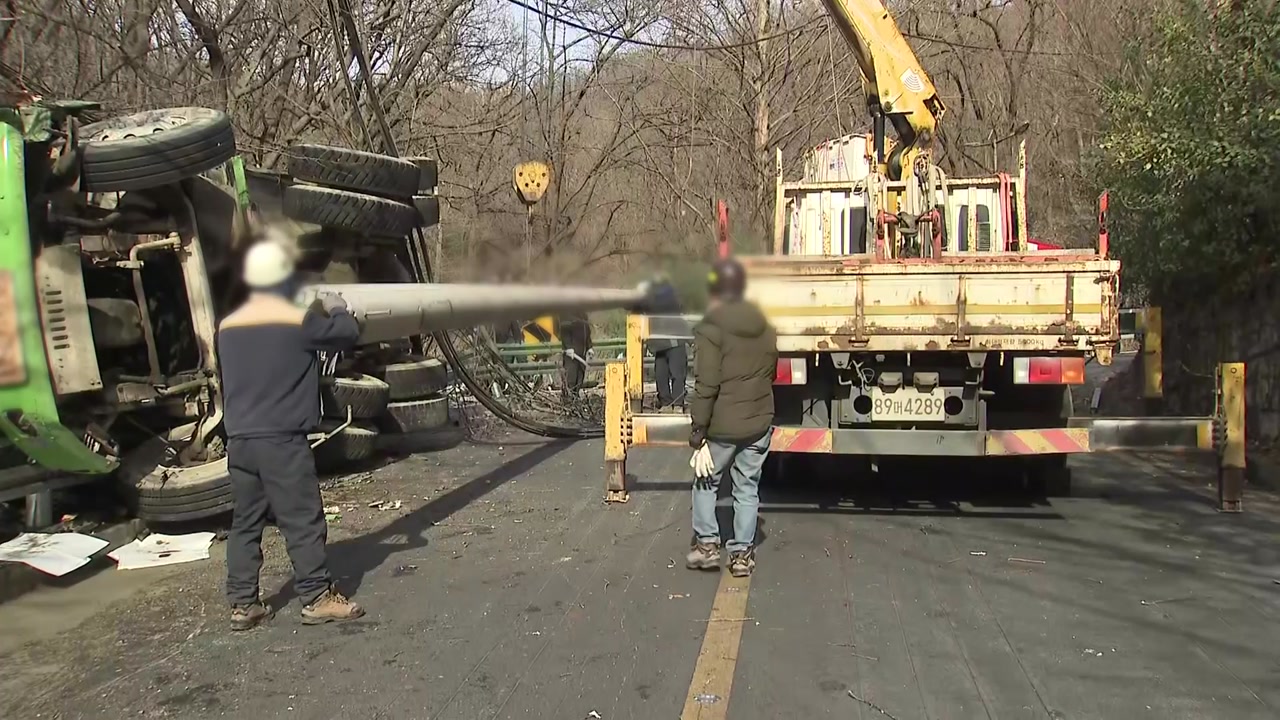 차량에 부딪혀 쓰러졌던 전신주는 1시간 전쯤 수습됐는데요.